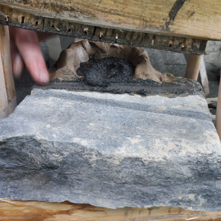 V neděli ráno, kdy nás čekal půldenní řemeslný workshop na zahradě místního muzea, nám už však déšť tak romantický nepřišel. Ale nezbývalo než nasadit kapuci a vydat se ven, kde od předchozího večera probíhal experiment s výpalem keramiky a vedle také s pečením masa v jámě. Velká grafitová nádoba, vyrobená studenty z Jihočeské univerzity podle nálezů z hradiště Na Jánu v Netolicích, se úspěšně přes noc vypálila a nerozpadla, zatímco maso se upeklo tak krásně, že se rozpadalo samo. Dále jsme pokračovali s výrobou různých hrubostí mouky z máčeného i suchého obilí, s řezáním a vrtáním kamene, které bylo představeno v jednom z příspěvků a také s ukázkami štípání pazourku. Všechno jsme si samozřejmě všichni mohli ozkoušet.