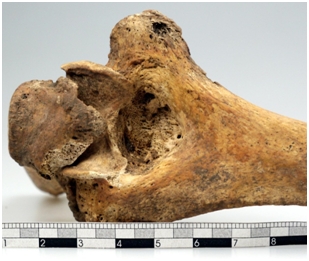 Vlevo: Detail distálního laterálního kondylu pravé kost stehenní s osteofytickými lemy.